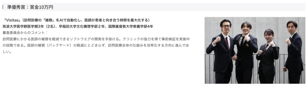 本コンテストでは、「訪問診療の『雑務』をAIで自動化し、医師が患者と向き合う時間を最大化する」というテーマで、代表の馬塲をはじめとするチームメンバー(馬場幸成、柴田唯仁、山田仁之祐、津布久龍一)がビジネスプランを発表いたしました 。 実際のクリニックの協力を得て事前検証(PoC)を進めている現場主義のアプローチが評価され、今回の受賞に至りました 。
